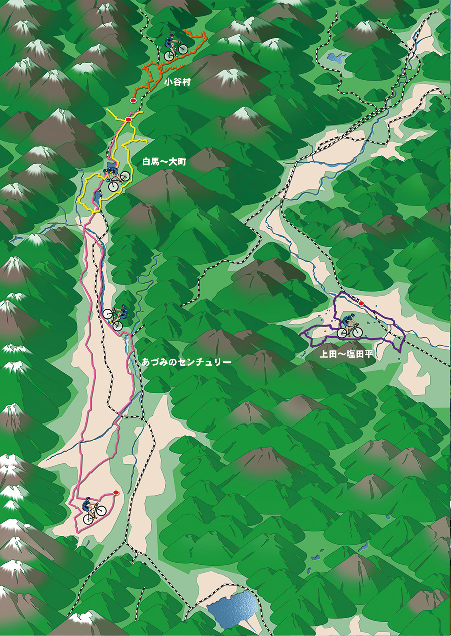 南北に細長く延びるルートに沿うようにJR大糸線が走っており、輪行を組み込みショートカットしたり、スタート&ゴールを変更したりと、鉄道を利用することでコースを自在にアレンジすることができる