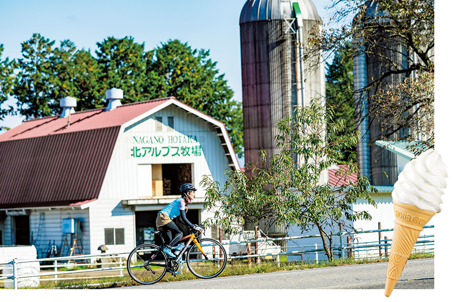 安曇野の穂高高原にある牧場。豊かな自然の中で育った牛たちから搾る新鮮な牛乳で作られたソフトクリームはコクがあって濃厚! しっかりと、牛乳の味が生きている