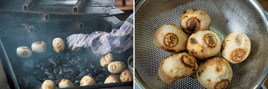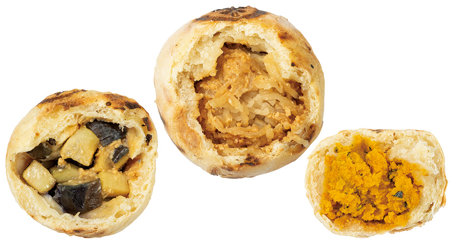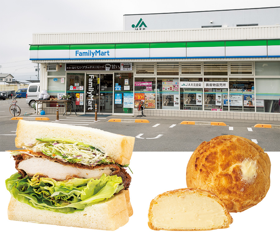 地元産の野菜、果物、米などのほか、おやきやスイーツなども販売 。「岳樺」のコシがありながらふっくらしたパンに、甘辛ソースをかけたカツとシャキシャキレタスを挟む豪快なサンド。濃厚なクリームがパンパンに入った特製シューも人気