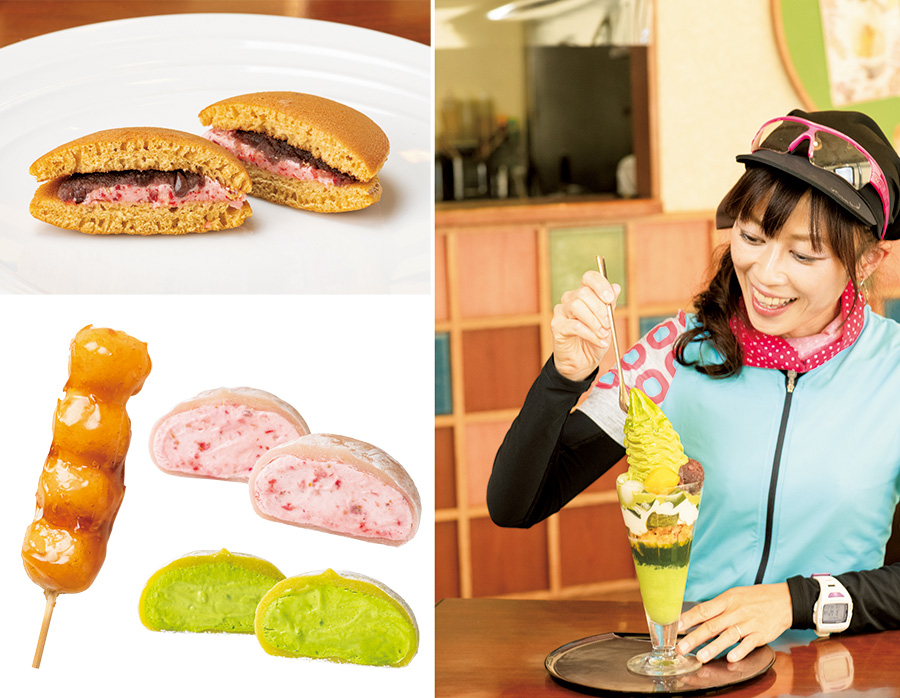 明治7年創業のお茶元の人気スイーツ。高さ30cmもある「抹茶パフェ」。抹茶ソフトや寒天、ジュレに栗や白玉、あん、わらび餅が! 苺クリーム入り「苺あんバタどら焼」、いちご、抹茶クリームの「とろける生大福」、やみつき系「揚げみたらし団子」