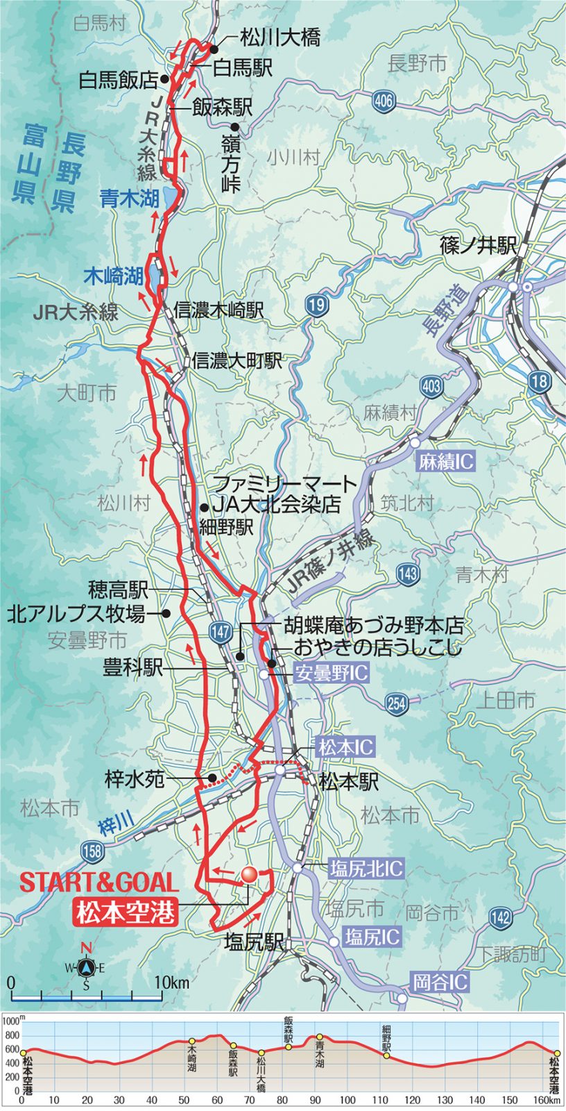 松本を出発、安曇野を抜け、白馬で折り返す100マイルコース。全域に田園風景や美しい川、湖と美景が広がる。とくにコース内随所に現れるきりりと気高い美しさを見せる北アルプスの存在感は絶大。残雪のある季節は、雪の白色が山の輪郭を際立たせ、迫力を増す。スタートは、鉄道利用なら特急が止まる松本駅を選び、クルマや空路なら松本空港や宿泊施設などの駐車場を使うケースが多い。