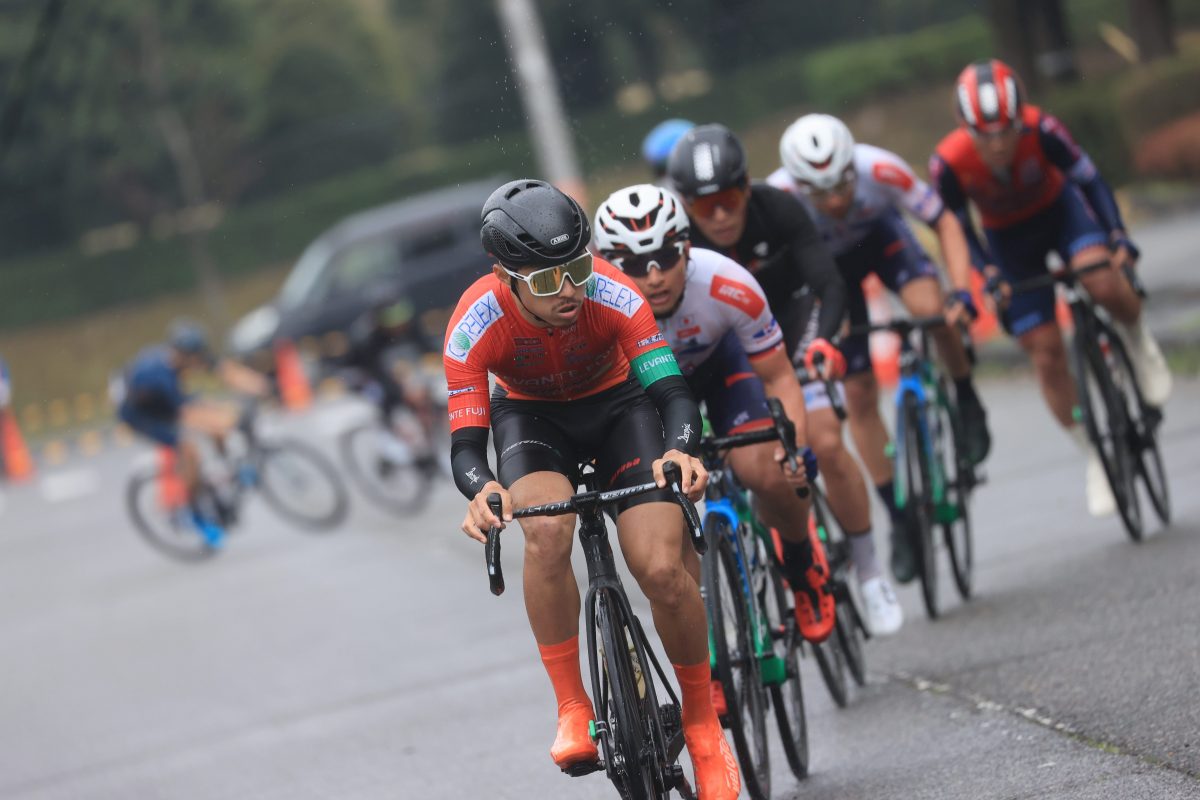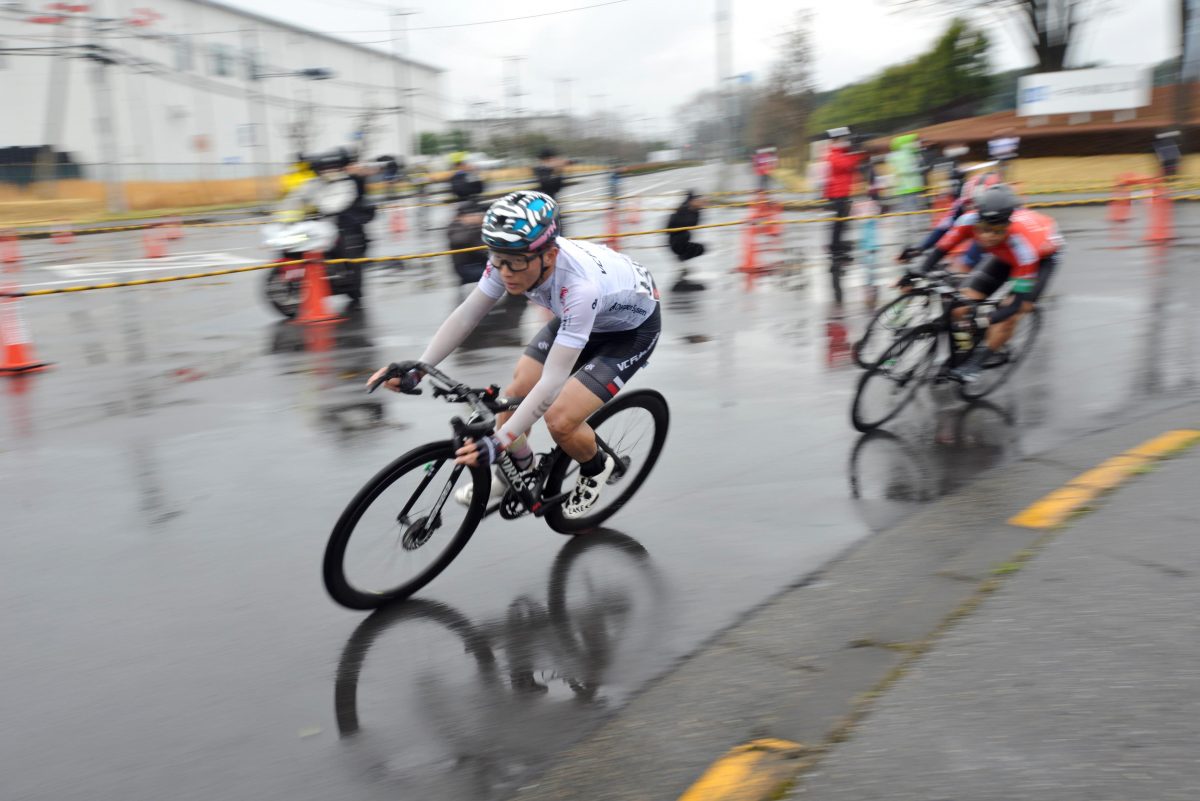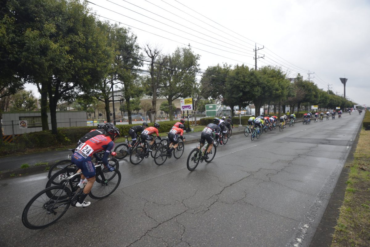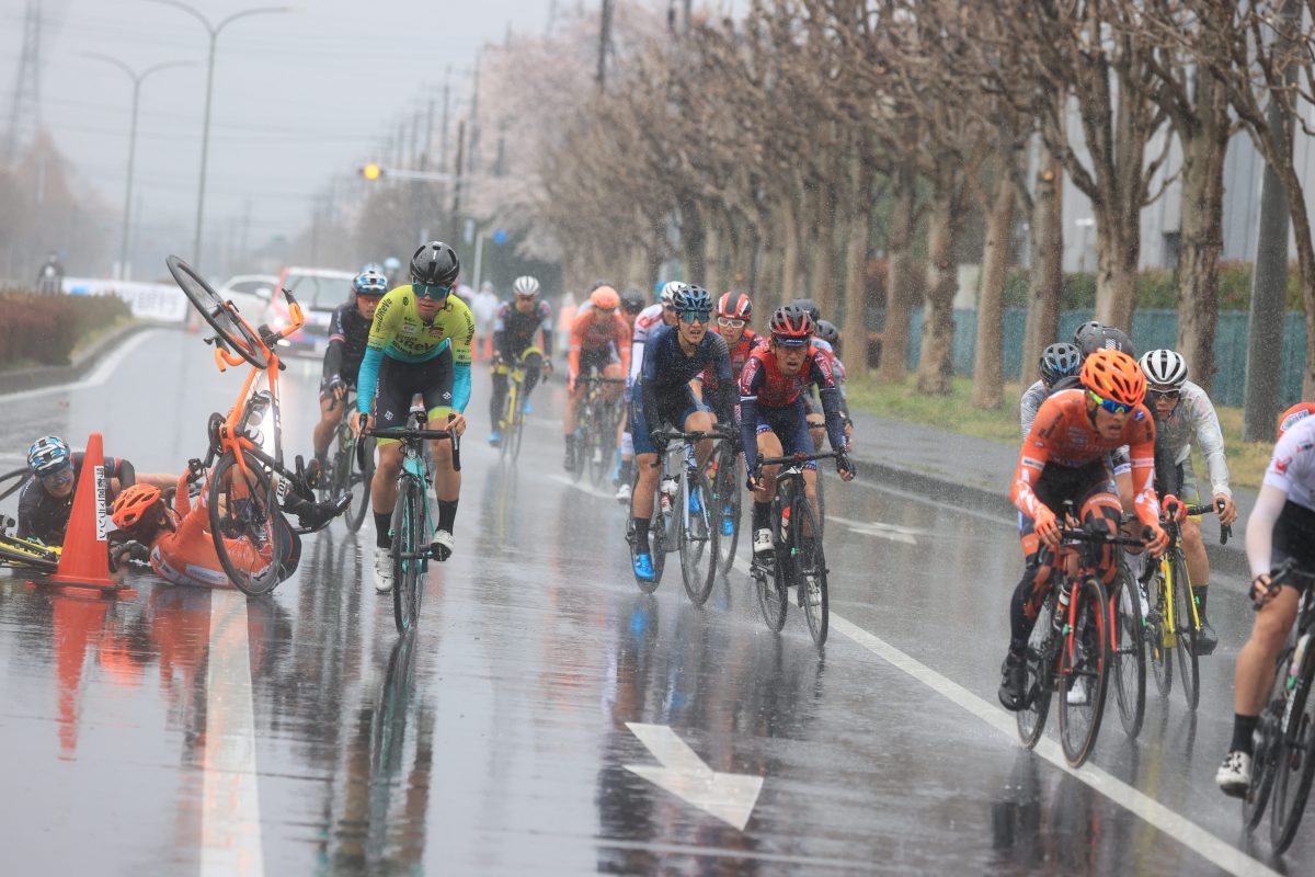 午前中から降り始めた雨は、午後1時15分のスタート時には勢いを増し、風も強くさながら嵐の中でのレースとなった。レース序盤に先手を取りたいチームが攻撃を仕掛け、集団は最初からトップスピードに。しかし3周目の直角コーナー手前、複数人が巻き込まれる落車が発生。この日有力なスプリンターの1人、黒枝士揮(スパークルおおいたレーシングチーム)も転倒しダメージを負った。スパークルおおいたはキャプテンの黒枝咲哉も序盤でリタイア。スピードマンを多く揃えて台風の目とされていたが厳しい展開となった。