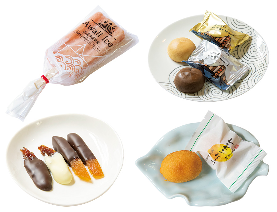 左上/淡路産食材の「あわじアイス」 右上/オレンジ餡入り「オレンジマール」 左下/砂糖漬けした鳴門オレンジやいちじくにチョコがけしたスティック 右下/「レモンケーキ」