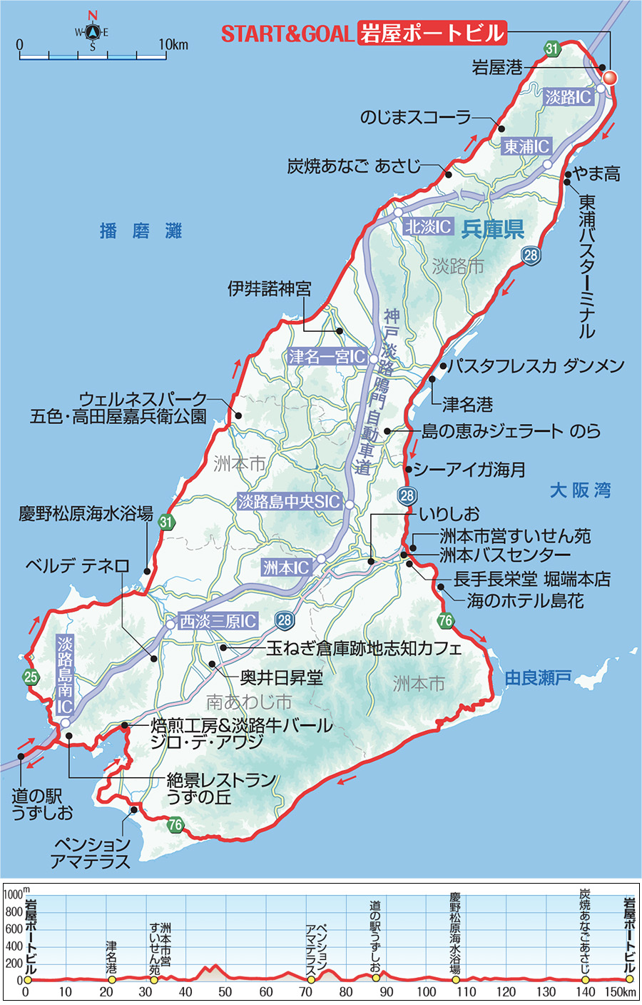 海岸線を中心に走るが、淡路島が誇る花や緑豊かな美しい景観、点在する史跡、質の高いグルメなどをフルに満喫できるのも大きな魅力。島一周約150kmとビギナーでも挑める距離だが、獲得標高は2130mと少々ハード。厳しいアップダウンが集中している南側をどう走るかプランを持って臨みたい。道中宿泊を挟み、ゆったり楽しむのもよいだろう。東岸の朝日、西岸の夕日など、時間限定で楽しめる景観もチェックしておこう。