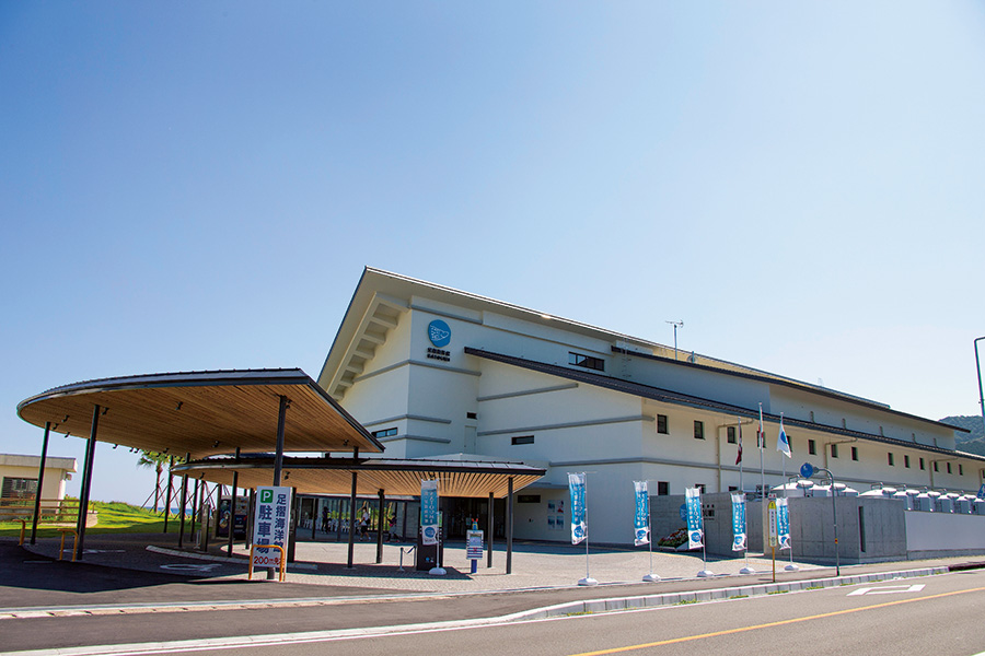 リニューアルした海洋館。竜串湾の生き物を中心に展示。カフェも併設。建物裏には土佐日記にも登場する美しい「桜浜」が広がる。海の中には熱帯魚が!