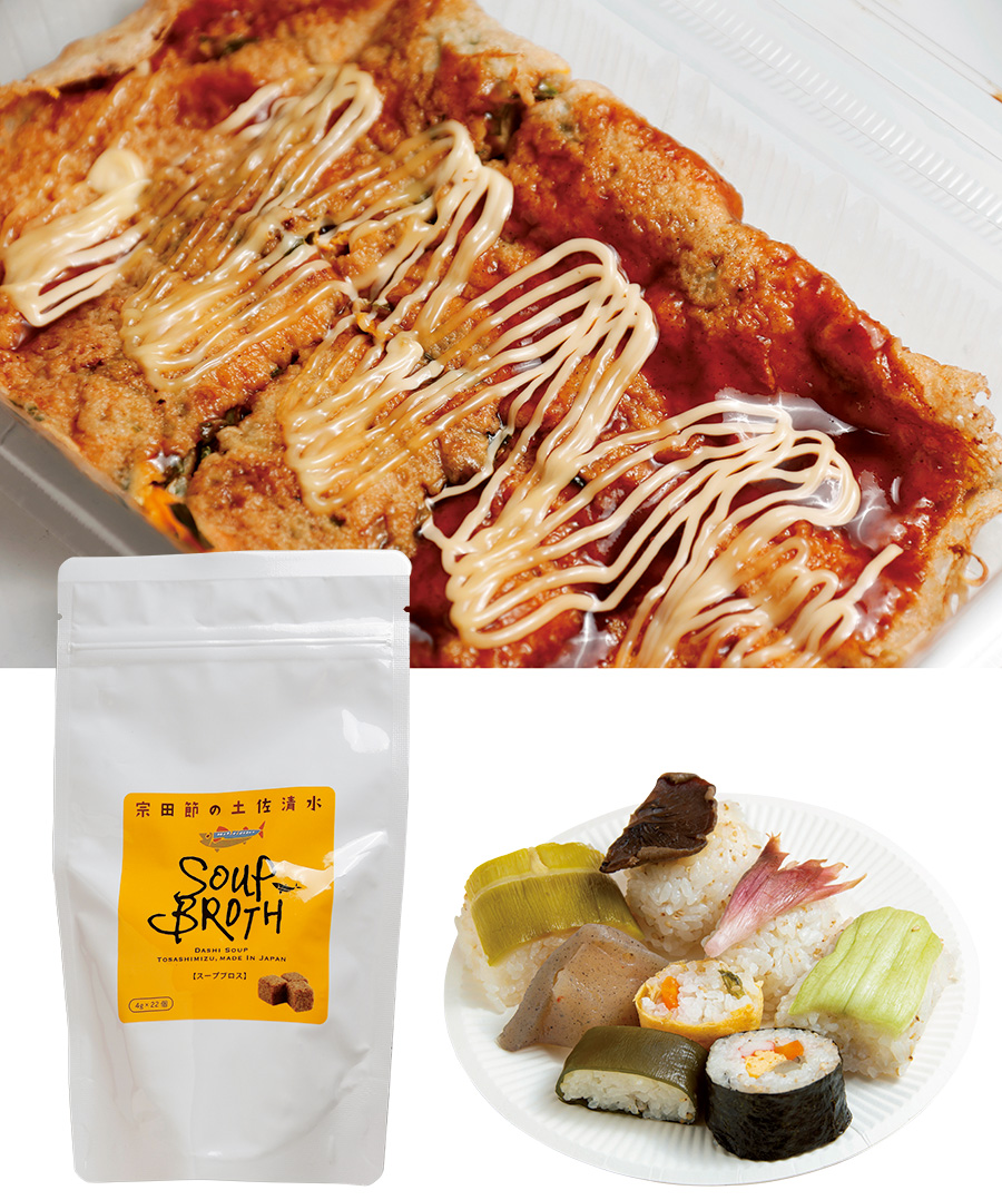 上/土佐清水のソウルフード「ぺら焼き」 左下/お湯を注ぐだけで土佐清水名産の宗田節を手軽に味わえる「Soup Broth」 右下/柚子の効いた寿司飯に野菜類を乗せた「田舎寿司」