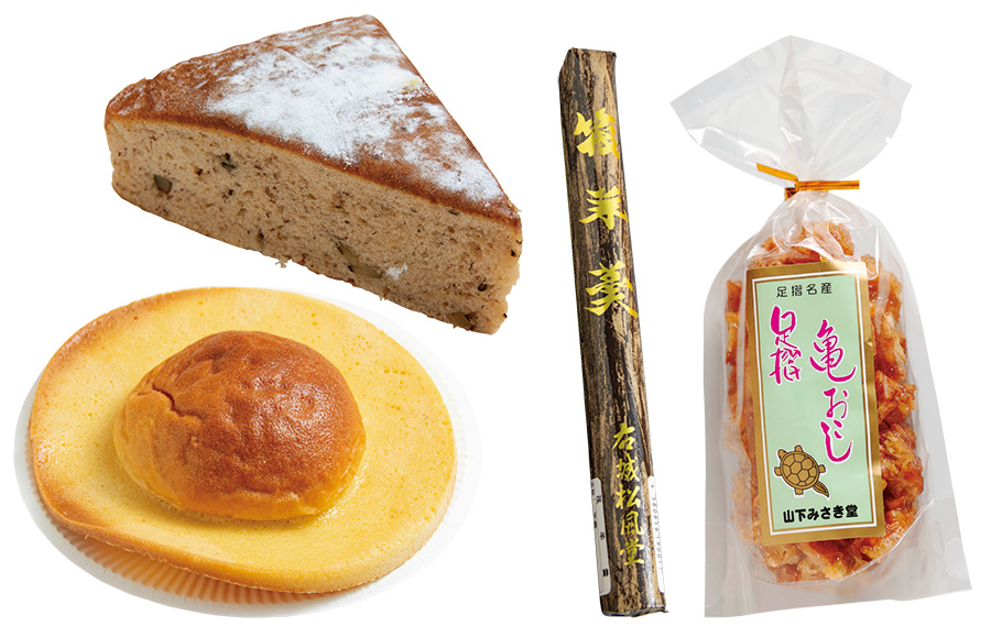 中村の老舗「ピノキオ」の 「ぼうしパン」と 「バナナケーキ」。「右城松風堂」の「筏羊羹」。さつま芋の砂糖菓子は「亀おこし」