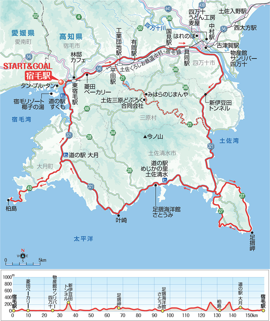 激坂はないが、アップダウンが繰り返し現れ、距離も長く、じわじわ脚に来る。獲得標高は約1600m。時間を見て岬や柏島をショートカットしてもいいだろう