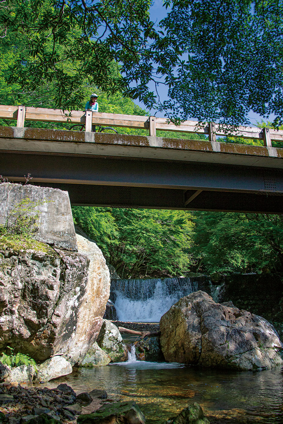 竹や紅葉樹が並ぶ道を上り、上流に近付くほど清流のすぐそばを走れる。走りすぎてしまうのがもったいないと思うほど、美しい木漏れ日と川のせせらぎに包まれる