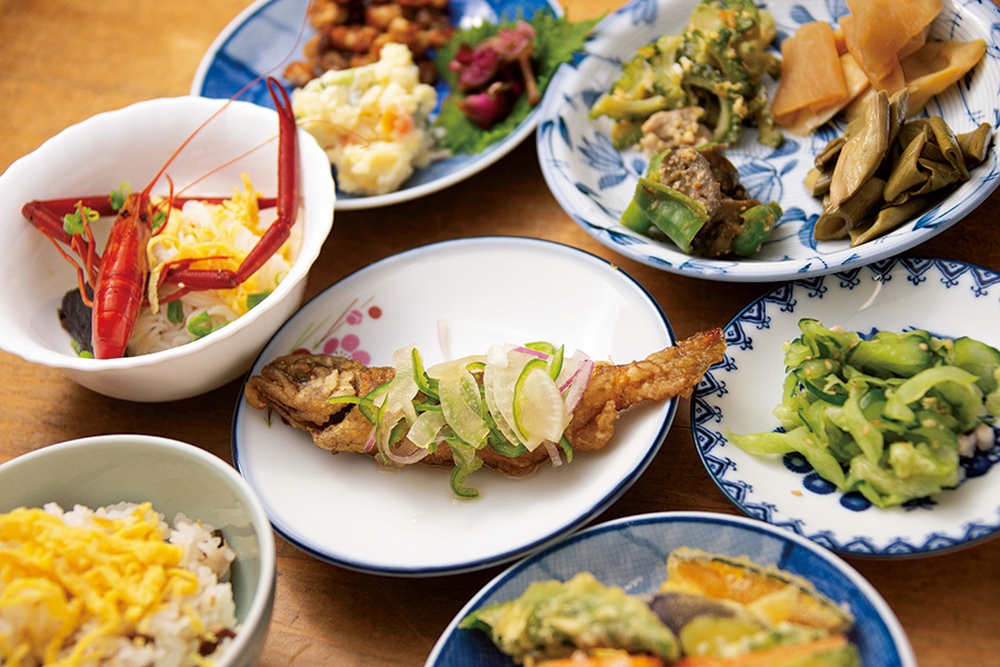 地域の旬の食材を使った家庭料理が並ぶ。品数豊富で味付けも絶妙、価格はなんと大人1000円(税込)! 料理する地元のお母さんたちとの交流も魅力(通常はビュッフェ形式)