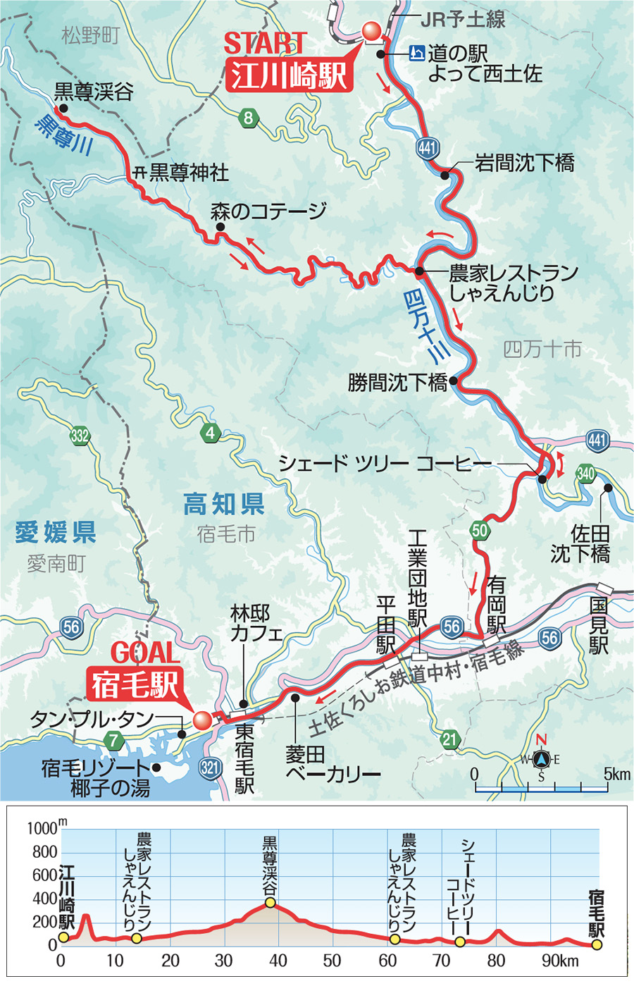四万十川の流れが近く、走りながら雄大な広がりを間近に眺められる西土佐、口屋内や勝間など人気の沈下橋もコースに含まれる。スタートの江川崎や西土佐、ゴールの宿毛エリアにはグルメスポットも多く、立ち寄りや土産の購入にも困らない。四万十・黒尊の2つの川と宿毛の海の絶景を楽しめ、地域のグルメも堪能できる。まさに「いいとこどり」のぜいたくコース。