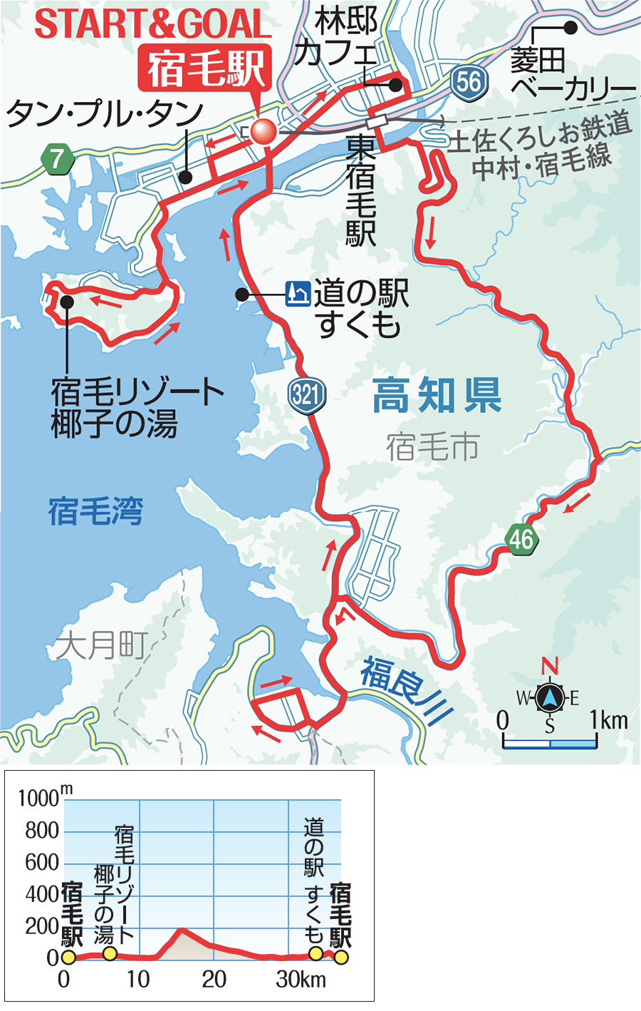 サイクリング環境を急速に向上させている宿毛の街と海、山を楽しむショートコース。宿毛駅では輪行袋の貸し出しや自転車乗車可能な列車も運行され鉄道も利用しやすい。レンタサイクルやマップ等の情報も豊富で、宿毛を起点にすれば多様なプランが組めるだろう。宿毛は夕日の美しさに定評があり、夕景を楽しめる行程もオススメだ。