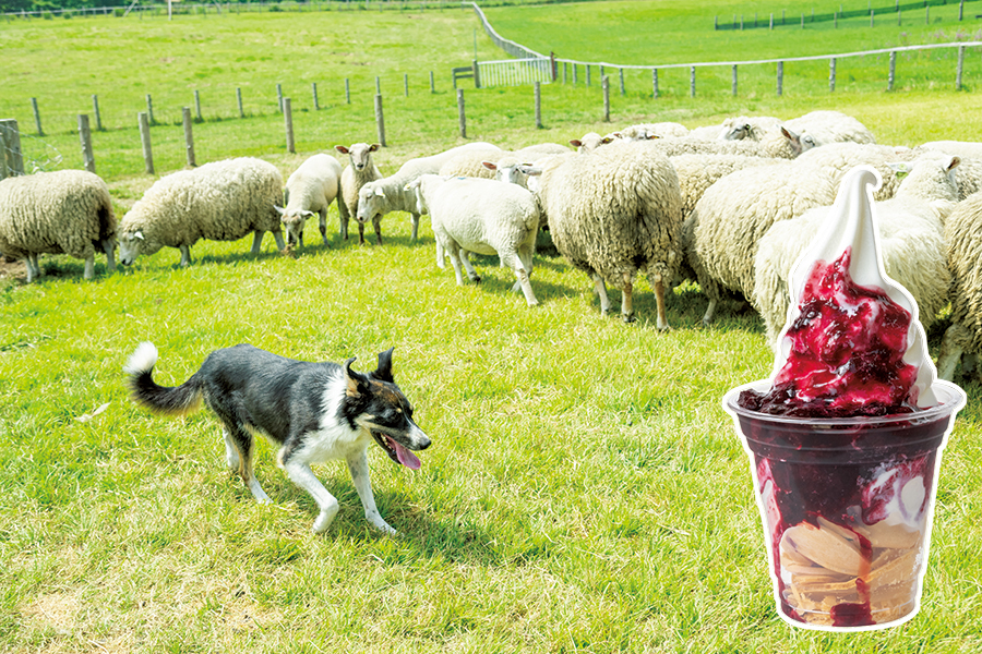 シープドッグショーも好評。牛乳の味を生かした手作りソフトクリームにブルーベリージャムをかけて。2ヘクタールものブルーベリー園を併設。レストランや温泉もあり ※冬期休業あり