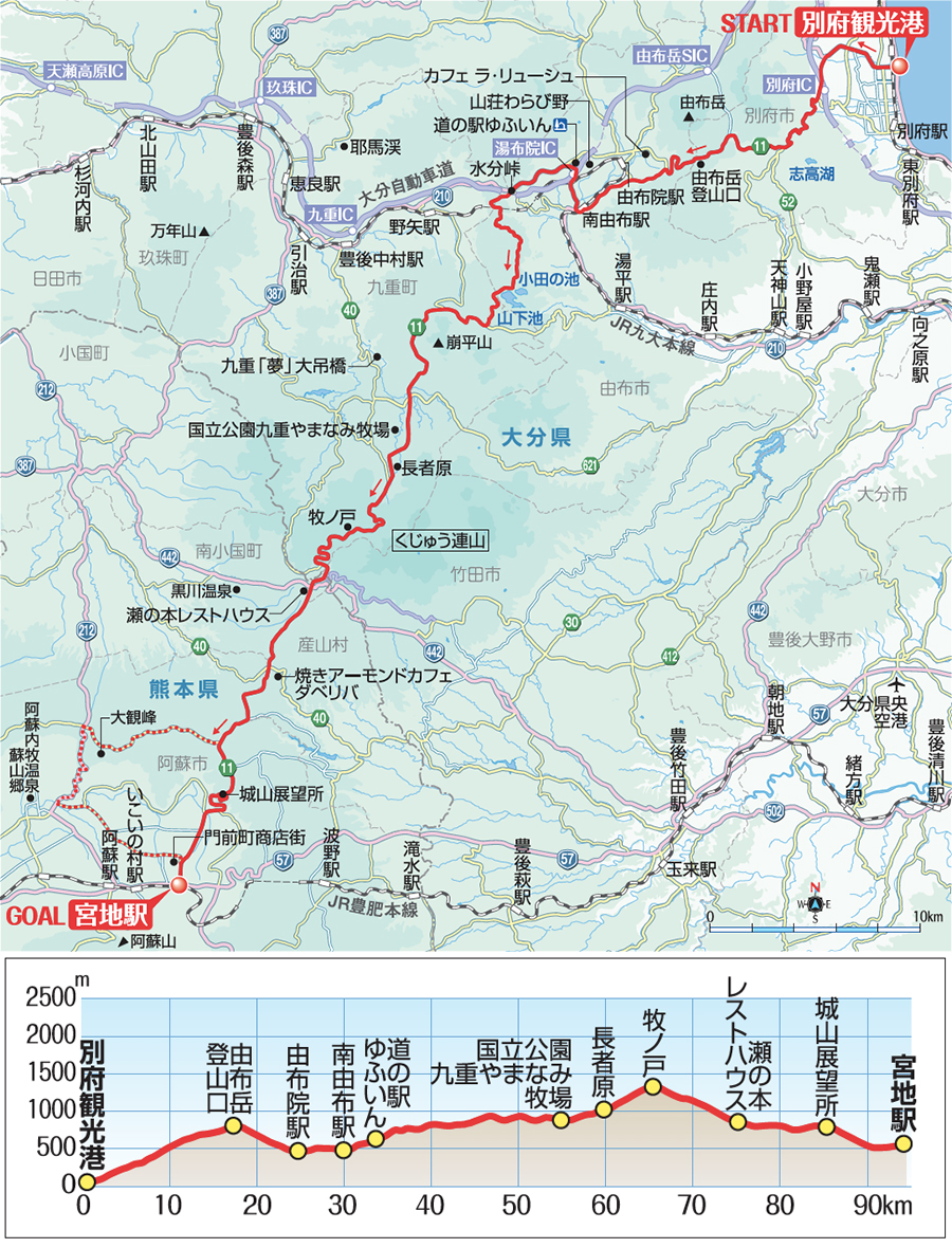 獲得標高は2600m弱。スタートから65kmほど上り、牧ノ戸以降は下るシンプルな構成。タフなルートだが、取り巻く景観の美しさに不思議と楽しく走れてしまう