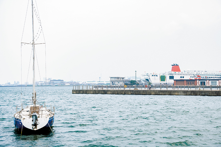 停泊する船と海の景色が美しい西大分港。付近はおしゃれな桟橋やカフェが並ぶ