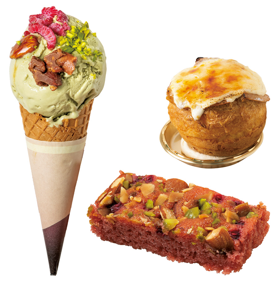 左/色鮮やかなフランボワーズケーキ 右上/中にラム酒の効いたカスタードとキャラメリゼしたバナナが入ったシュークリーム 右下/フランボワーズやナッツをあしらったピスタチオアイス