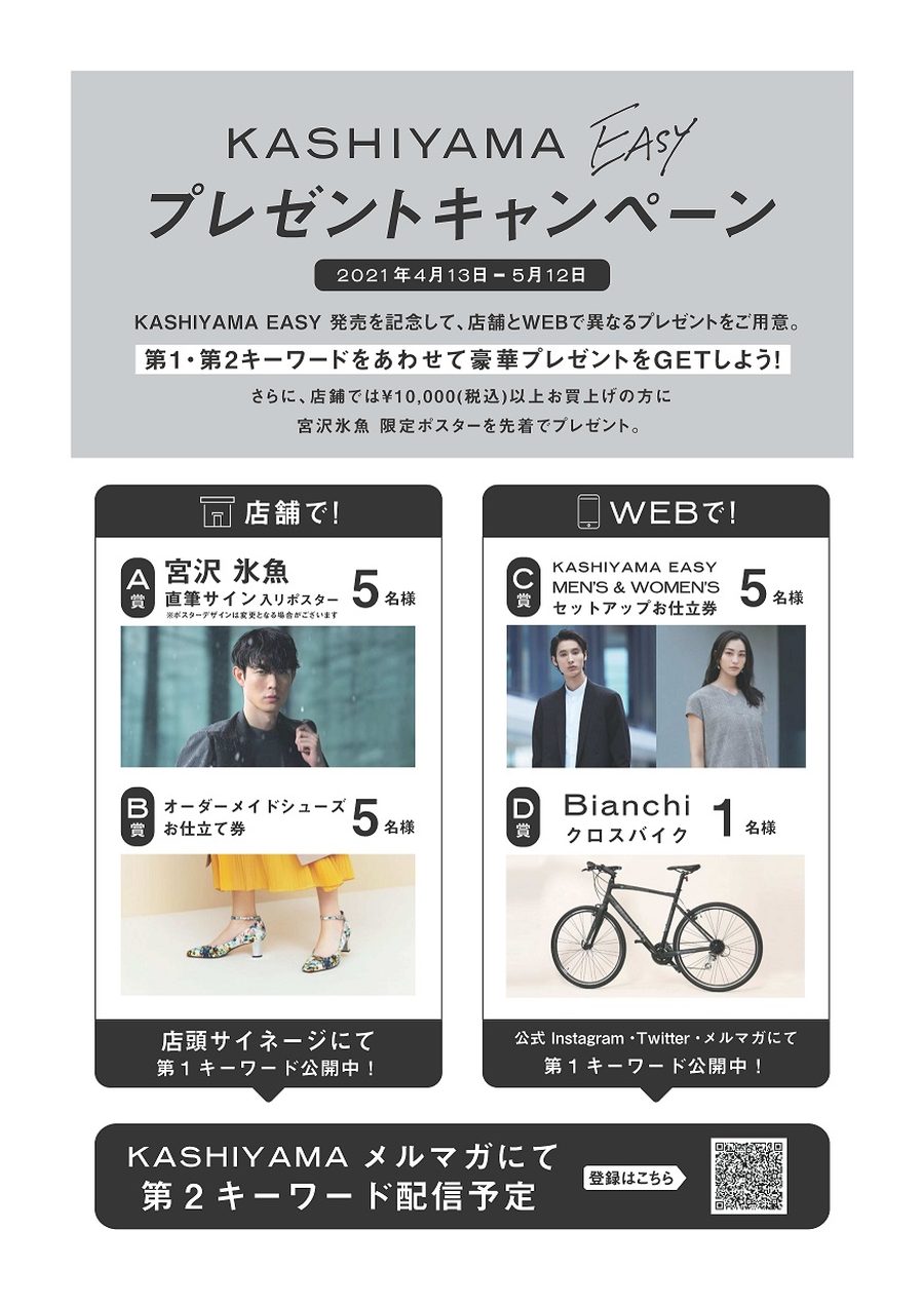 2 つの異なるキーワードを集めて応募をしていただくと、宮沢 氷魚さん直筆サイン入りポスター、新ライン『EASY』の MEN’S&WOMEN’S セットアップや、『KASHIYAMA』の WOMEN’S オーダーメイドシューズのお仕立券、『Y’sRoad』の Bianchi クロスバイクなど豪華賞品が当たるプレゼントキャンペーンを 4 月 13 日(火)より実施します。