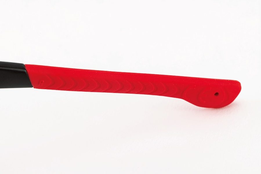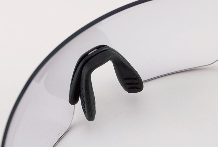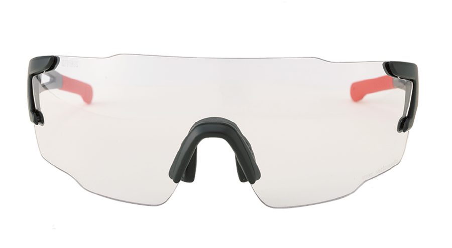 超軽量でレンズ、フレームともに柔軟性が抜群。その存在を忘れてしまうほどフィット感に優れる。ノーズパッドやイヤーピースを鼻や耳の形に可変して合わせると、ライディング時のズレや落下を確実に防いでくれる。目に対しては調光機能が素早く働き、流れる視界のなかでもライダーが環境変化に戸惑うことなく、確実なラインをトレースして走れる。レンズまわりはフレームレスで、下ハンの低いフォームでも視界が広くとれる。