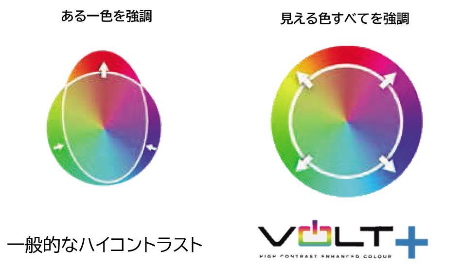 一般的なハイコントラストレンズが一部の色を強調するのに対し、VOLT+は色を全体的に強調するため自然な色を感じられるイメージだ。