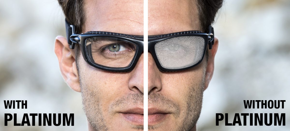 さまざまな環境下で作業する人を保護するボレーのセーフティーアイプロテクターに採用されているのと同じ、レンズ両面に超防曇(くもりにくさ)、超耐傷(傷つきにくさ)コーティングを施す「プラチナムコーティング」を加工している。ボレーでは天候やコース状況の変化が激しいオフロードレース向けとして、スポーツアイウェアに採用している。
