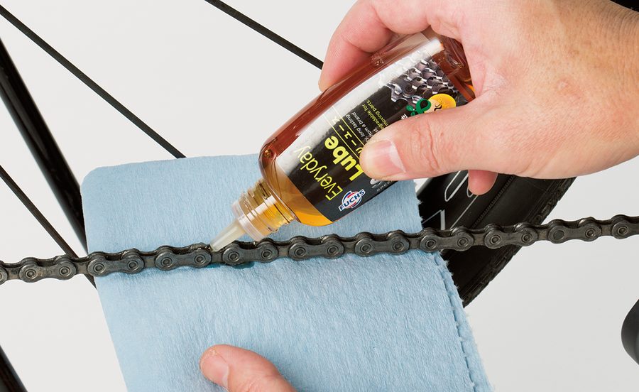 チェーンオイルは、スプレー式が手軽で便利に感じる。しかし、多くはウエスに吸収されることになりオイルの浪費になりがち。スプレー式の場合、フレームやリム側面など油が飛び散って拭き直すこともある。リキッドタイプのほうが、じっくりとひとコマずつ垂らしていくのでムダが少ない。高級なリキッドタイプのチェーンオイルをしっかりクリーニングしたチェーンにじっくり垂らすのがいちばん効率的。