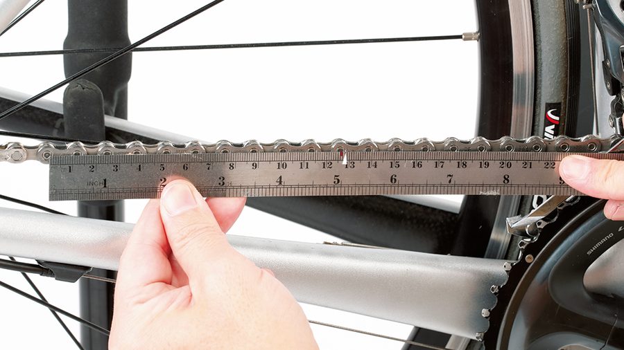 チェーンの伸びはチェックして交換。伸びたチェーンは、変速性能が悪くなるだけでなく、スプロケットやチェーンリングの摩耗を加速させる。まだ走れるからと交換をケチって放っておくと、思わぬメカトラブルでチェーンよりもさらに高額なパーツの寿命を縮めることにもつながる。チェーンの伸びはチェーンチェッカーで計測できるが、ない場合チェーンのピッチ10コマ分を物差しで測ることでも計測できる、11速の場合は0.5%以上の長さになっていたら交換だ。