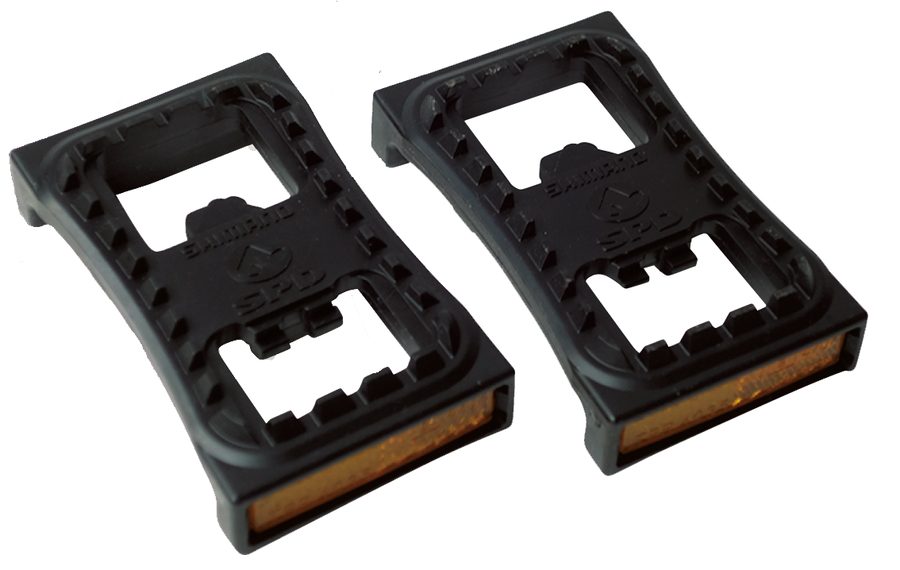 シマノ・SM-PD22リフレクターユニット。両面SPDペダルが片面フラットのリフレクター付きペダルに。日常はコレで本格ライドでは外すという運用も。