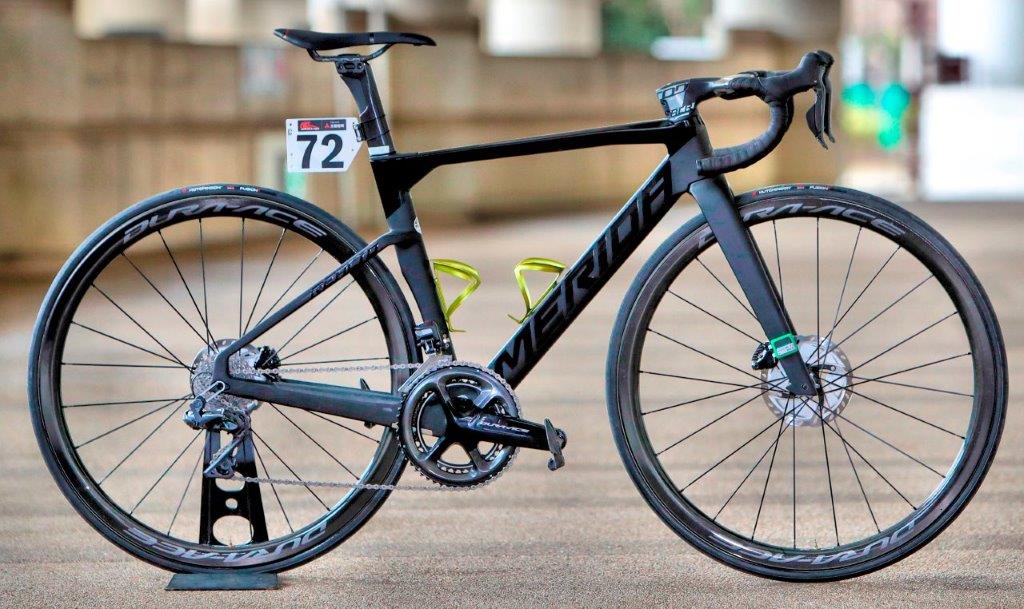 同モデルはメリダの最上位グレードのCF5フレームを採用し、空力性能と軽さを高い次元で融合。前後のディスクブレーキキャリパーを覆うようにアルミ製のディスククーラーを設け、放熱性を高めることで常に安定した制動力を発揮するのも特徴だ。