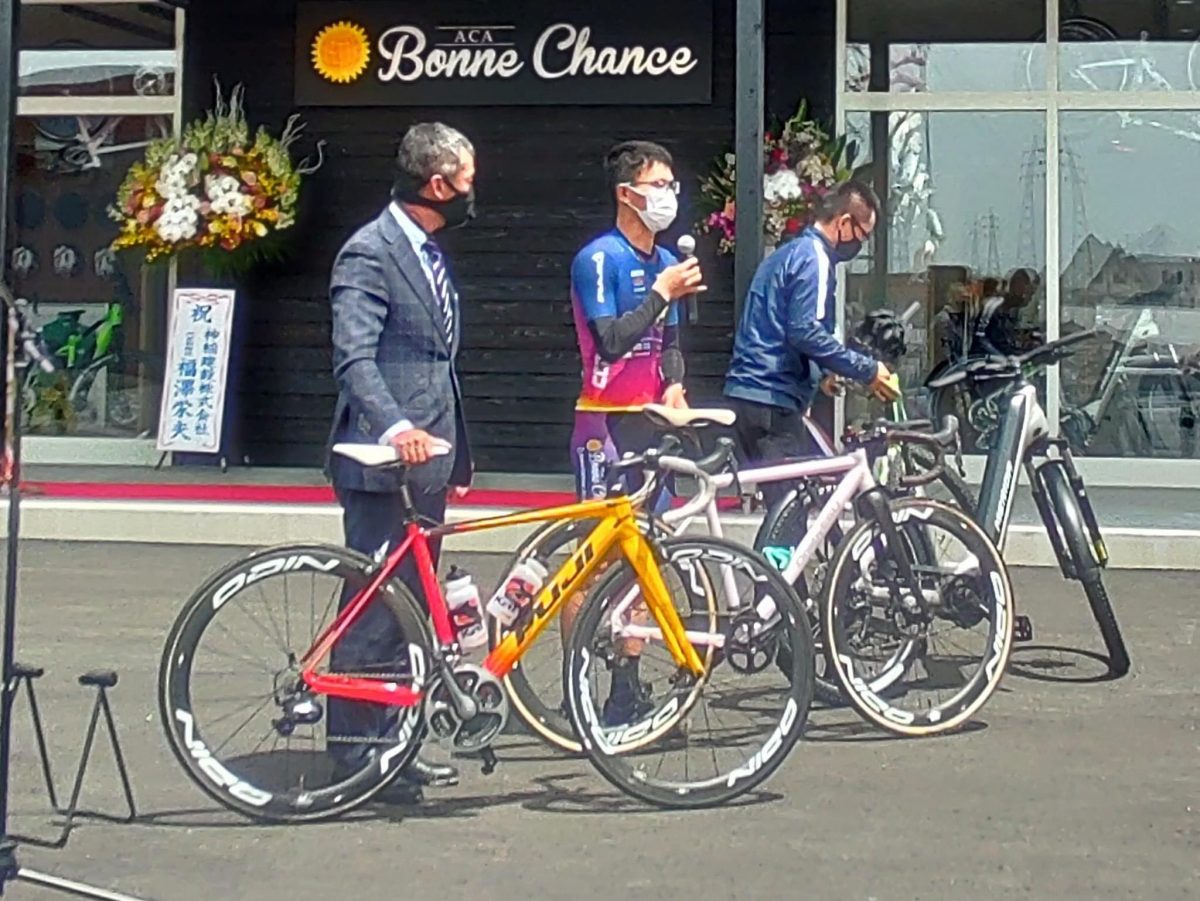 5月8日、元日本ロードチャンピオンの福島晋一さんがプロデュースする「ボンシャンス サイクルベース」が長野県下伊那郡豊丘村の観光拠点「とよおか旅時間」内にオープンした(グランドオープンは5月29日)。その開所式とテープカットを行われ、 近隣町村の町長、村長、県議会議員の方が一堂に会した。さらにボンシャンスの福島晋一さん、現シクロクロスU23日本チャンピオンの鈴木来人選手、矢野智志店長による自転車紹介がおこなわれた。