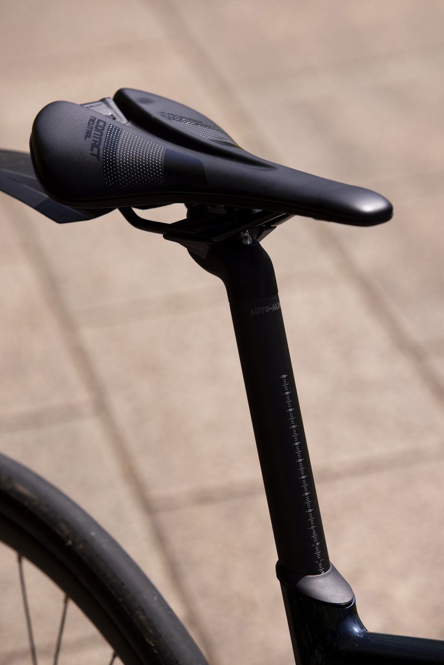 サドルはジャイアントのコンタクトニュートラルサドル。座面の大きさ、中央のミゾ長、サドル後端の高さが、ジャイアントのサドルラインナップ中最も真ん中に位置するニュートラルモデル。フェンダーやライトをワンタッチで取り外せ、フェンダー装着時もスタイリッシュ。フェンダーを付けない場合はユニクリップシステムによって別売のサドルバッグも取り付け可能。ライトはUSB充電式でかなり明るく、オートライトモードも備えており、私はこのサドルを愛車TCRに取り付けたくなってしまった……