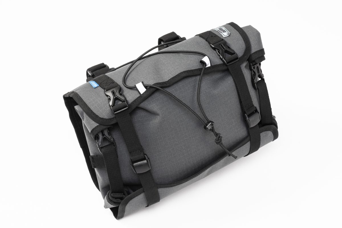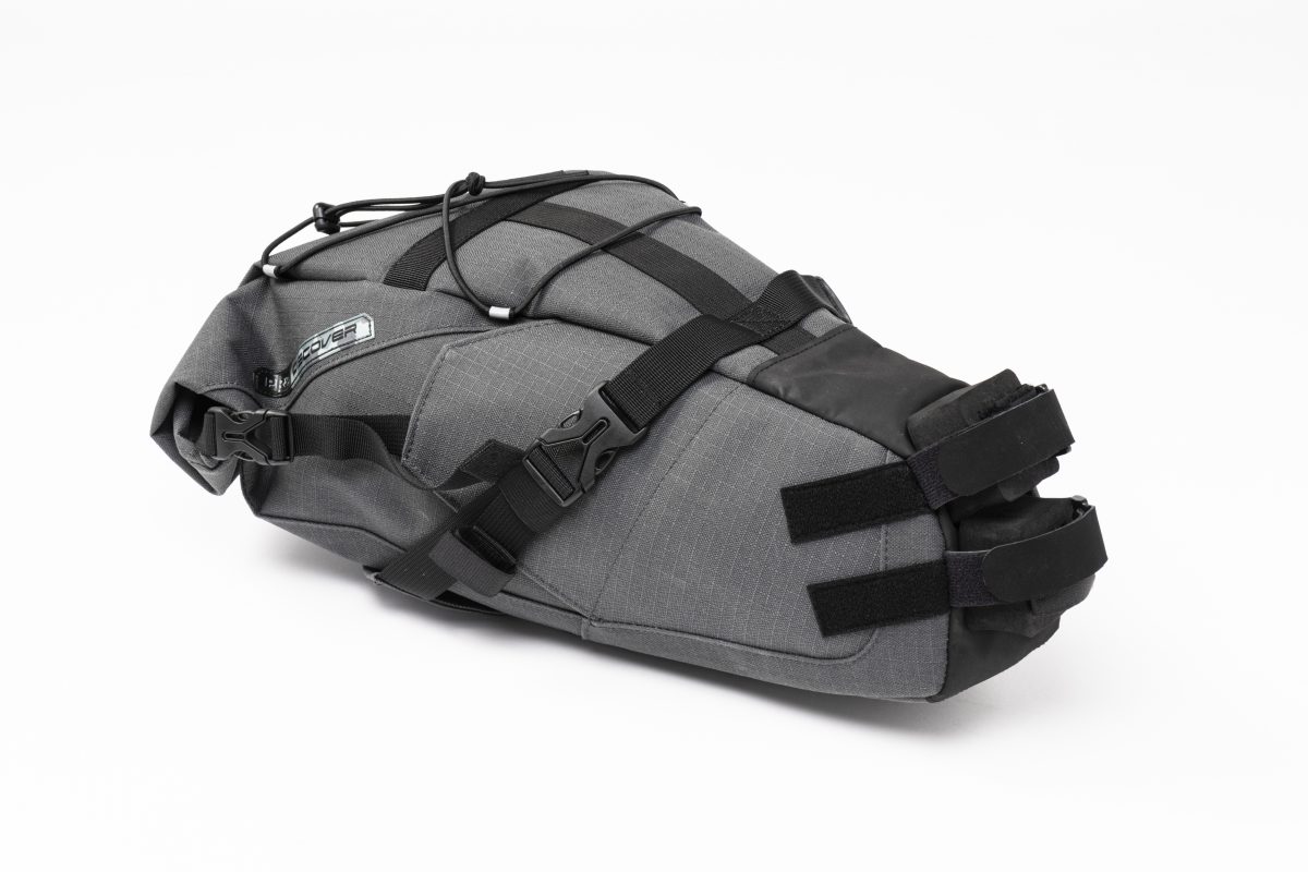 高い収納力をもつ耐水仕様のシートバッグ。グラベルツーリングに必要な多くの荷物を入れられる。さまざまな形状のシートポストに装着可能で、しかも横揺れしにくい。リアライトや熊よけ鈴なども取り付けられる。