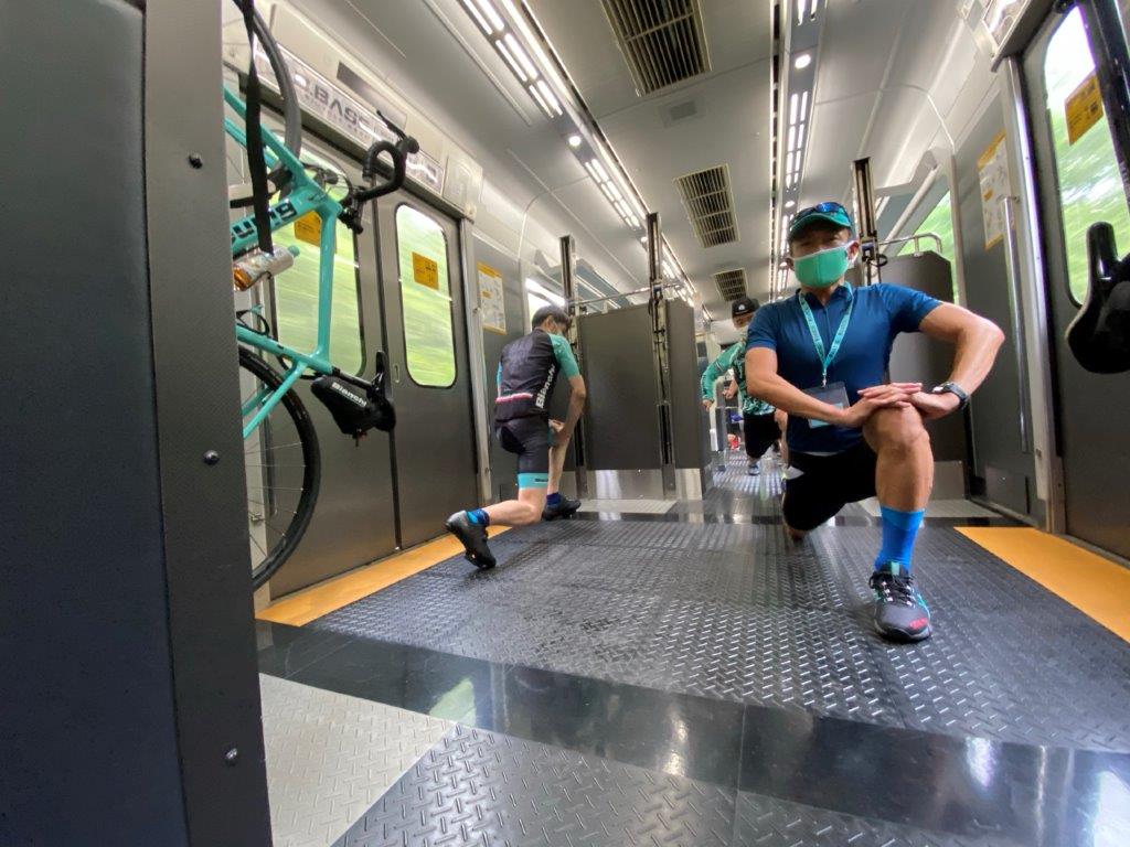 自転車ブランド「ビアンキ」が運営するだけに、ツアーの中身もスペシャルな内容だ。ゲストとしてプロトライアスロンコーチの青山剛さんが参加し、列車の中でストレッチをおこなうという通常では味わえない体験が味わえた。
