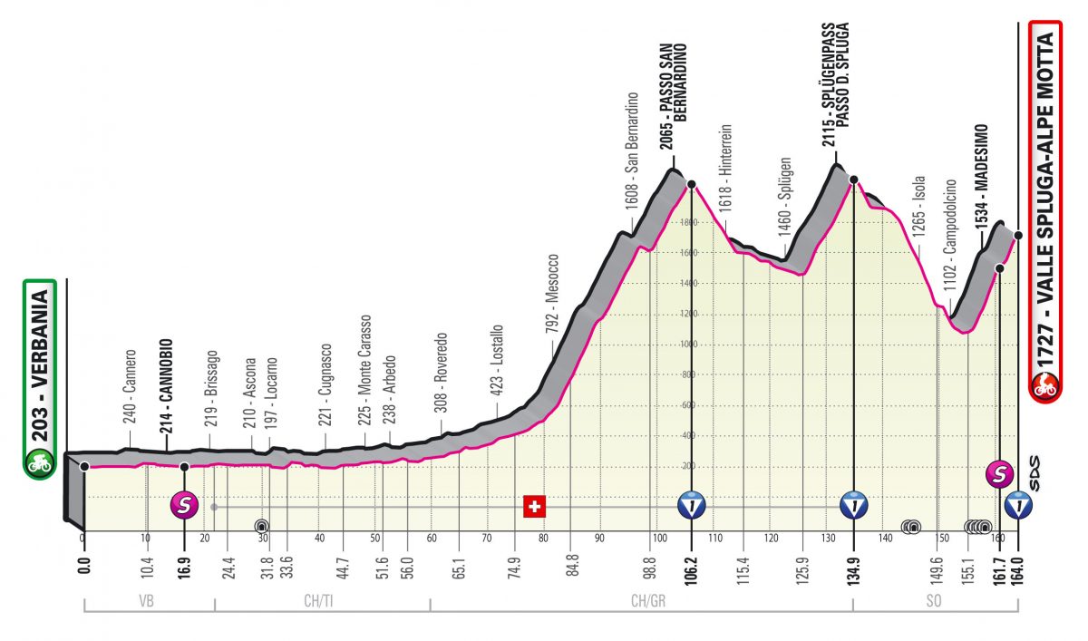 山岳最終決戦となるこの日は、最終日の個人タイムトライアルを前に、通常のロードレースとしても最後となる一日。コースは164kmと若干短めの距離に、3つの1級山岳が詰め込まれた。序盤に隣国スイスへ入国。23.7kmのロングヒルクライムとなる1級山岳パッソ・サン・ベルナルディーノ(平均勾配6.2%)を越え、すぐに1級山岳シュプリューゲンパス=パッソ・デッロ・スプルガ(8.9km、7.3%)へと続く。頂上でイタリアへと戻ると、その後はテクニカルなダウンヒル。最後は1級のアルペ・モッタの山頂フィニッシュで雌雄を決する。