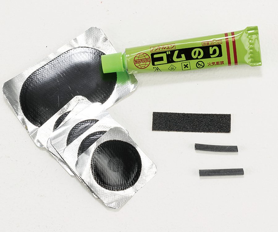 今回使用したパークツールの「スーパーパッチ」は、のり付きのパッチ。コンパクトで作業時間も短く済むので、外出先でのパンク修理に便利。写真上のマルニの修理キットはパッチとゴムのりが別で、ゴムのりを乾かすのに時間がかかるが補修後も頑丈だ。