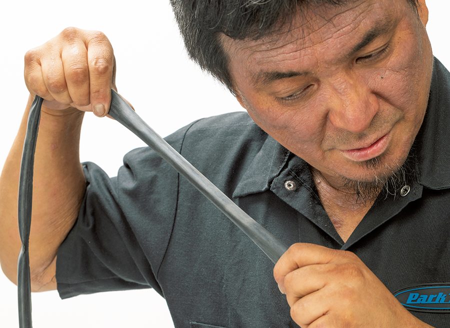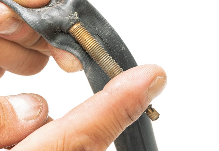チューブのパンクは、バルブまわりからの空気漏れも多い。リムの穴にまっすぐ入っていないと、余計な力がかかってさらにパンクしやすい。パッチでは補修できないので、新品のチューブに交換することになる。とくに携帯ポンプで空気を入れる際、バルブが根元から折れることが多いので気をつけよう。