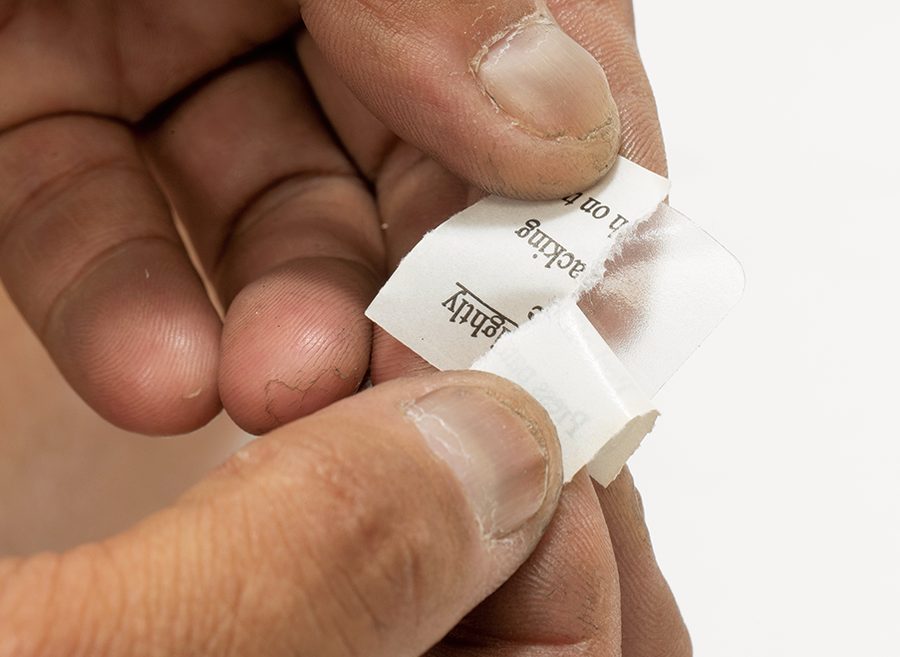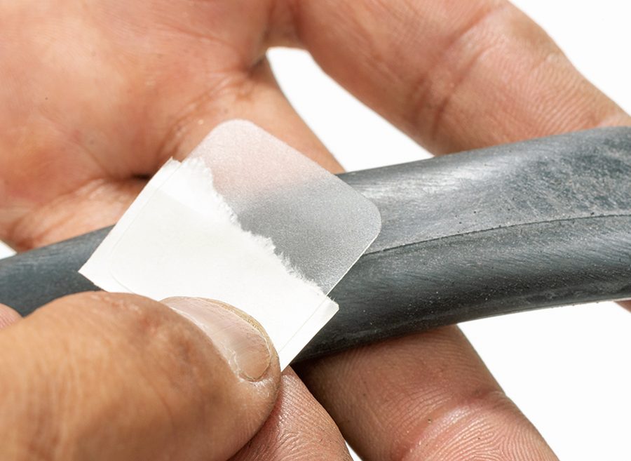 パンク箇所が見つかったら、パッチをあてる。ゴム糊を使うタイプの場合には、先にゴム糊をチューブに塗って完全に乾かす。パッチを貼る際には台紙を半分だけはがして、位置を決め仮止めしよう。