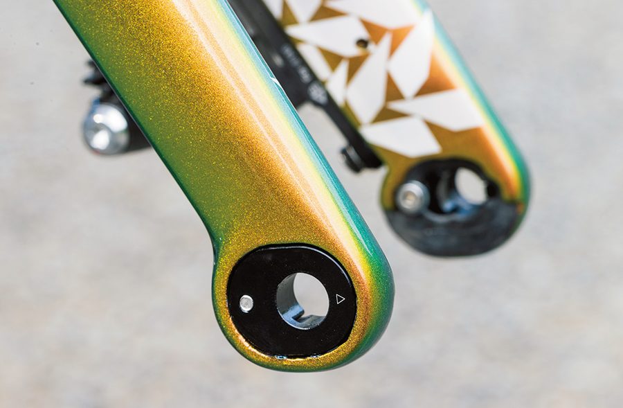 フォークエンドに設けられたトレイルミキサー。インサートの向きを変えることで、フォークオフセットを5mm変更できる