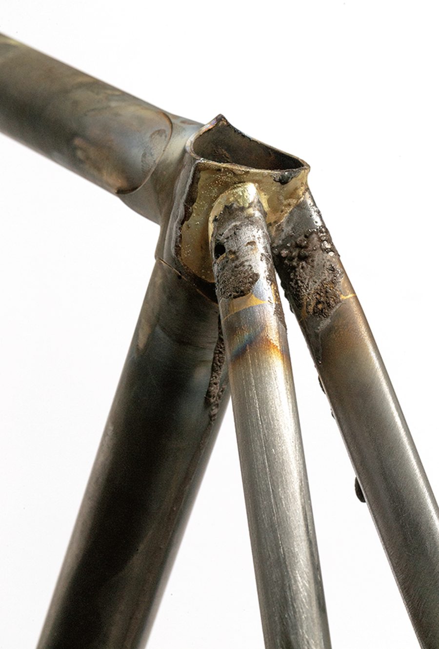 当時使われていたラグは、今野製作所の独自ルートで入手したもの。全盛期を彷彿とさせる3ポイントラグと、三連勝らしい、エアロな集合ステー部材を使う。また、エンドも当時のもの。三連勝ロゴ入りオリジナルのロストワックス製エンドとなる。