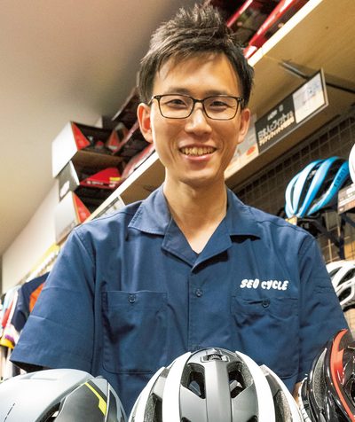 バイシクルセオららぽーと店の店長。ロードもMTBも楽しむ守備範囲の広さをもちつつ、ヘルメットの安全性と大切さを語る。