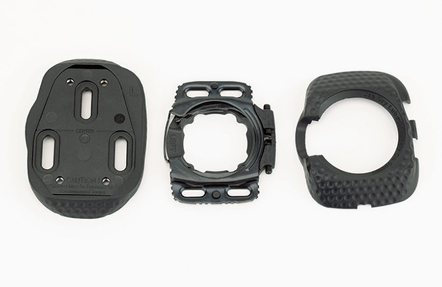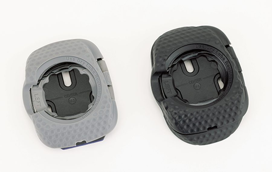 ベース(左)を取り付けてクリート(中央)をマウント。カバー(右)は歩行時の滑り止め&空力向上