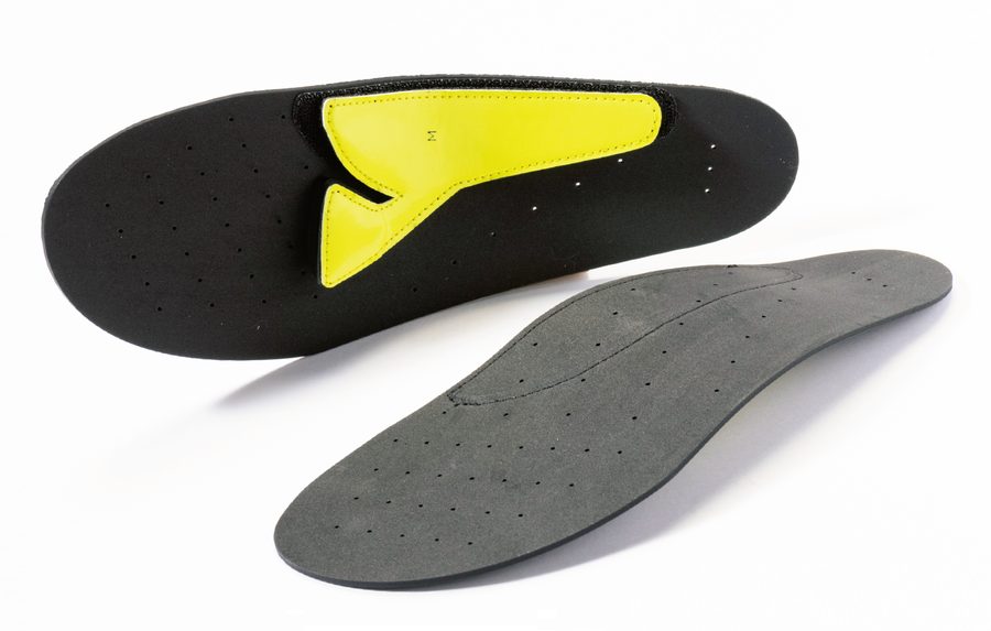 このインソールを正しく使用するには以下の手順が必要。①元のインソールを重ね合わせ、はみ出る部分をカット ②インソール裏のアーチサポートと中足骨用のサポート(ともにベルクロで着脱可能)をもっともフィットする場所に固定する。