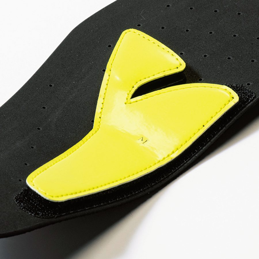 表側を見る限りふつうのインソールだが、裏側の黄色いアーチサポートパーツが特徴的。なんとベルクロで付け外しでき、最適なサポート位置を自分で決められる。前後に5cm、左右に1cmくらい移動可能だ