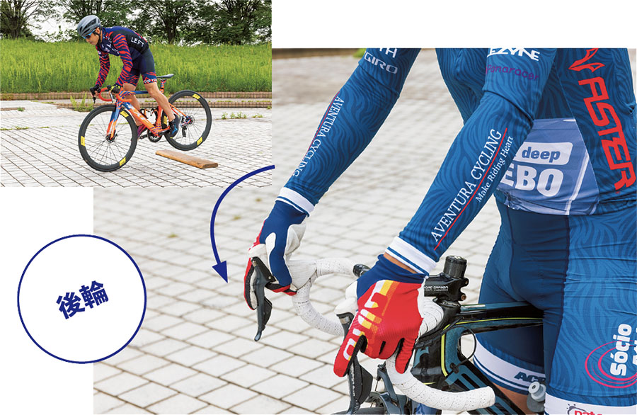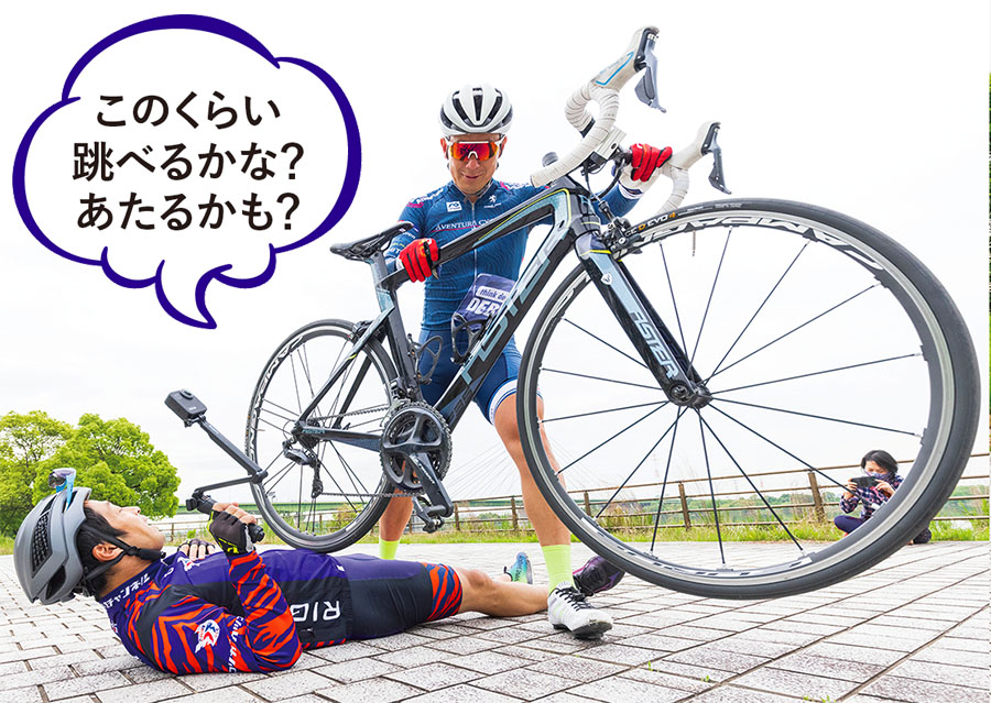 「今日は自転車でジャンプしましょう!じつは危険回避のときによく使うテクニックなんです。路面の横溝など凸凹があって横に避けられないとき、レース中に前で落車が起きたときなど跳んで避けることもあります。ジャンプは縦の動きのバイクコントロールです。オンロードではあまり使わない動きなので、自主的にやってみましょう」と管さん。