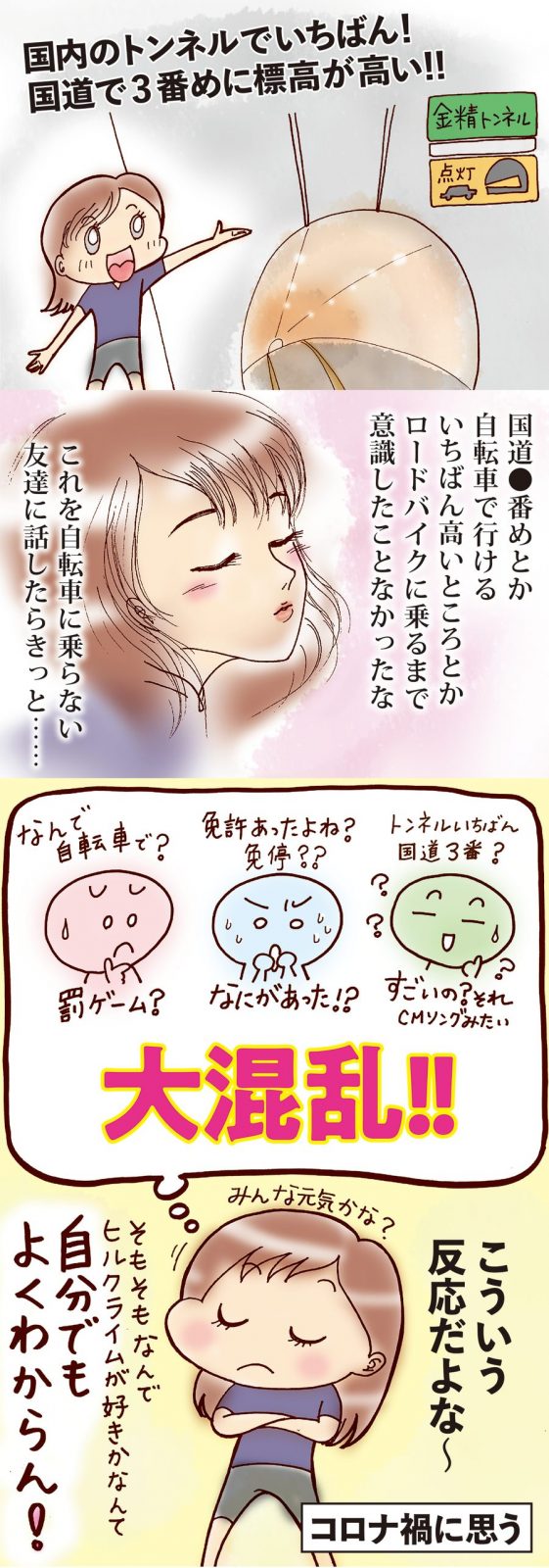 山ではなく、道路の標高を意識しているのって自転車乗り以外だと車やバイクを趣味にしている人でしょうか。でも、ヒイヒイハアハア必死に汗かいて喜んでいる生き物ってサイクリストくらいじゃないかな。われながら、ヘンなの(笑)