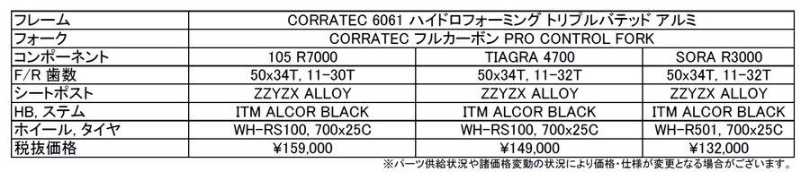 税抜価格:159,000円(シマノ・105)、149,000円(シマノ・ティアグラ)、132,000円(シマノ・ソラ)