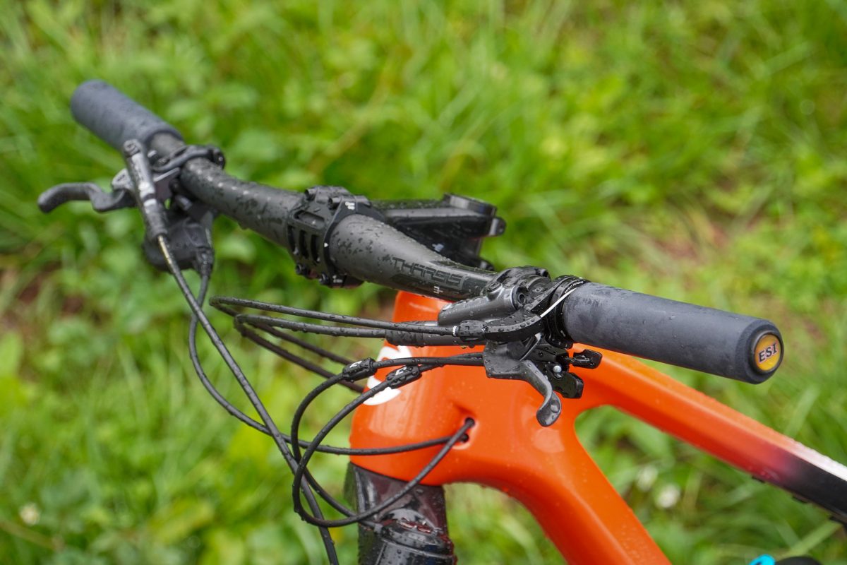 PRO Tharsis カーボンフラットバーとPRO Tharsis 90mmステムをチョイス。グリップは以前から愛用しているシリコン製のESIチャンキー