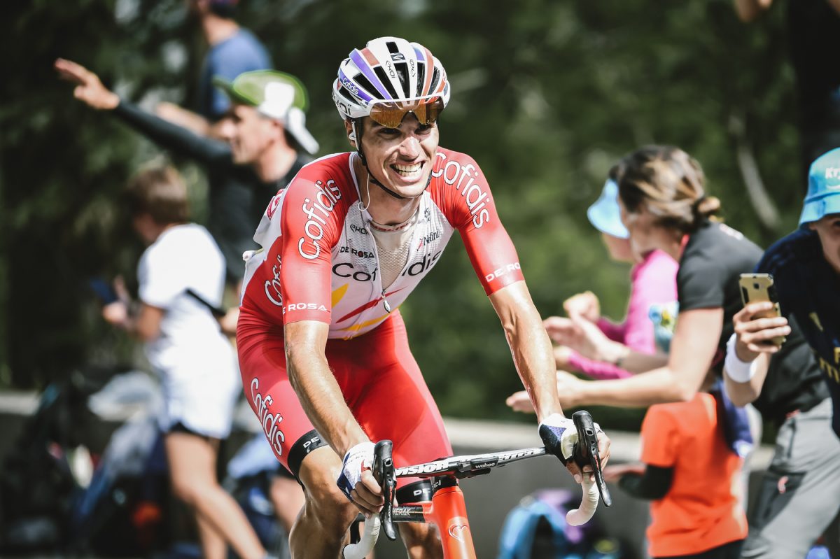 そして、決定打は残り150m。ポガチャルが最後のアタックとばかりに一気に踏み込むと、ここまで一緒に走ってきた2人を引き離すことに成功。コル・デュ・ポルテの頂上に一番に到達すると、マイヨジョーヌにプリントされたチームロゴを力強くアピールした。2位には3秒差でヴィンゲゴー、その1秒後にカラパスが3位で続いた。