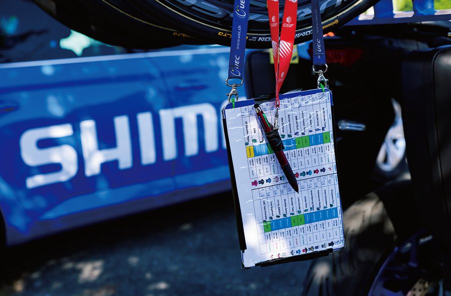 ホイールはリムブレーキとディスクブレーキだけでなく、各社の11速と12速、160mmと140mmのフロントブレーキローターに対応している。ペダルもシマノ、ルック、スピードプレイの3種類を用意。毎日チームの使用機材を入念にチェックして、リストを作成している。