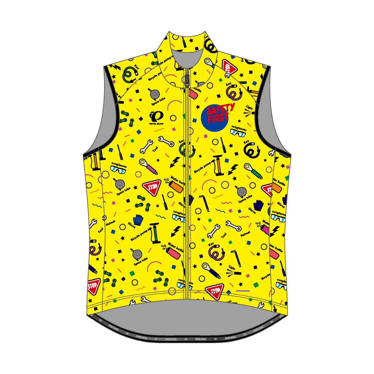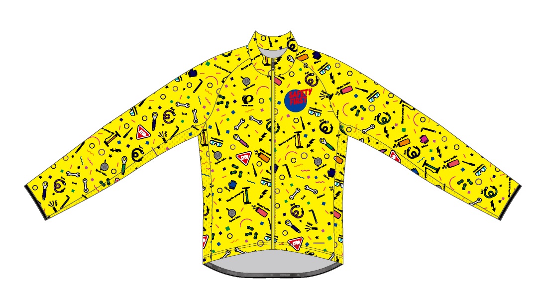 多くの人がスポーツサイクルに関心を持ち、さまざまなフィールド、スタイルで楽しむ方が増えている今だからこそ、あらためて”安全”への意識を高めてほしい。速い、強いもかっこいいけれど、安全第一のサイクリストが一番かっこいい! そんな”SAFETY FIRST”のメッセージを栗村さん本人のイラスト、そして安全走行に必要な小物などをモチーフに仕上げました。ウェア自体のカラーも視認性の高い蛍光イエローを用意しました。