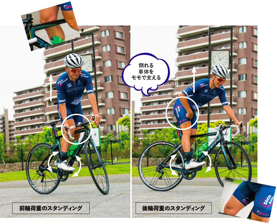 スタンディングは前輪荷重と後輪荷重の2種類。どちらも大きなポイントは同じで、①上体は高く②ハンドルをねじる ③車体に片モモを当てる ④足首を上下する。「足元を小さく動かしてバランスをとるので、上体は高いほうがいいです。コンパスをイメージしてもらえるとわかりやすいです。また、ハンドルをねじって、車体に片モモを当てて車体のバランスをとります。前輪荷重のときはフレームに片モモを当て、前輪のハブの上に喉をもっていきます。後輪荷重はサドルに片モモを当て、ヘッドパーツの上あたりに喉をもっていきます。さらに挙動を小さくするため、足首の動きだけ、つまりクランクのシーソーではなく、ペダルのシーソーとブレーキで動きをコントロールします」